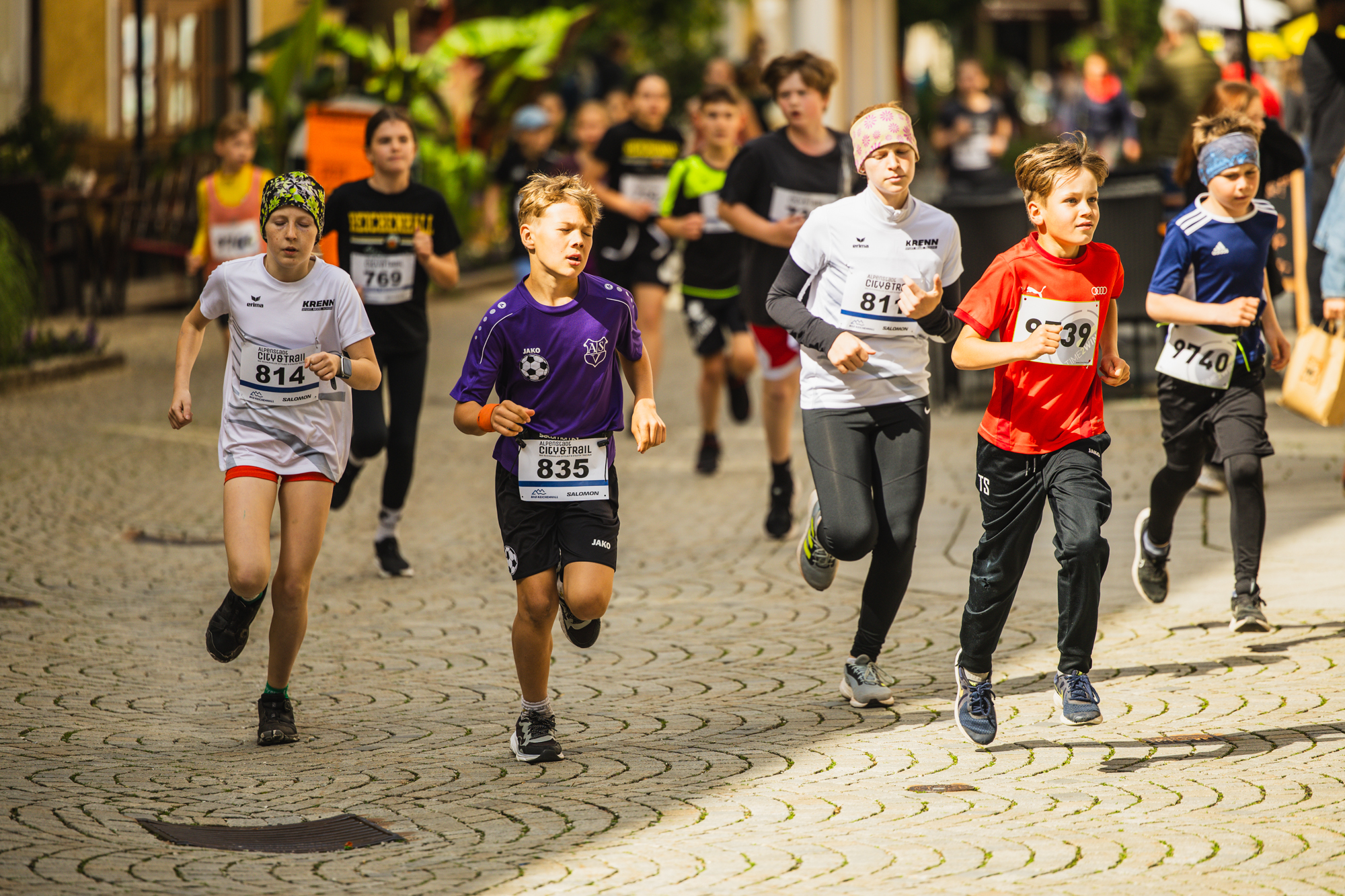 Drei – zwei – ein – los! Die Großen machen‘s vor, die Kids ziehen nach. Mit Tempo gehts mitten durch die Fußgängerzone (je nach Jahrgang eine 700 Meter-Runde oder zwei). Am Streckenrand toben die Fans, feuern an, frenetischer Applaus. Jeder gibt alles, jeder ist ein Sieger, jeder bekommt ein Teilnehmergeschenk.